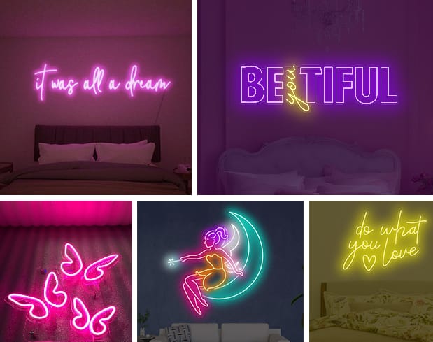 A neon sign is more than a light, it is a conversation starter, a mood-setter, and most importantly a reflection of who you are. Custom neon signs for rooms are a great way to enhance any area whether it be a bedroom, living room, kitchen, or study room. You can choose from a range of neon LED lights with different designs like “Home Sweet Home”, “Love & Peace”, “Be Happy”, “Hello Gorgeous” etc.